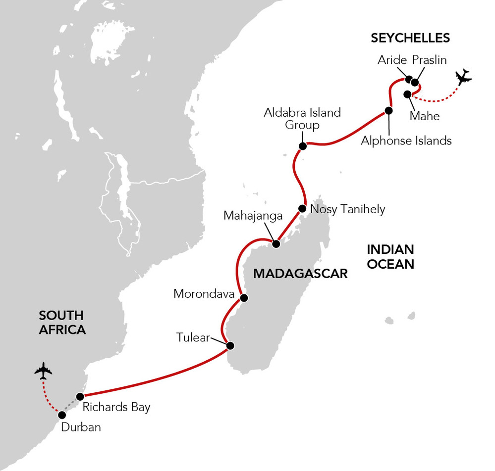 Here is an extraordinary cruise for those who enjoy the natural world and all its wonders. Join us aboard the all-suite MS Hebridean Sky and enjoy the warmth and beauty of the Indian Ocean as she undertakes exactly the type of itinerary that suits her many talents best. Our journey incorporates some fascinating and exotic calls combining the stunning islands of the Seychelles including the magnificent Aldabra Group with the natural wonders of Madagascar before arriving in Southern Africa’s wildlife-rich KwaZulu-Natal.